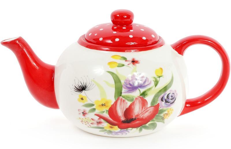 Чайник заварювальний "Акварель" керамічний - відмінний декор для сучасної і стильної кухні, і функціональний посуд. Порадує справжнього поціновувача завареного листового чаю або трав'яних відварів. Об'єм 1250мл. Молочна глазур з яскравими червоними елементами. Червона керамічна кришка в білий горошок. Розмір чайника: висота 14.5см, ширина з ручкою і носиком 28см. Заварник запакований у кольорову подарункову принт-коробку.